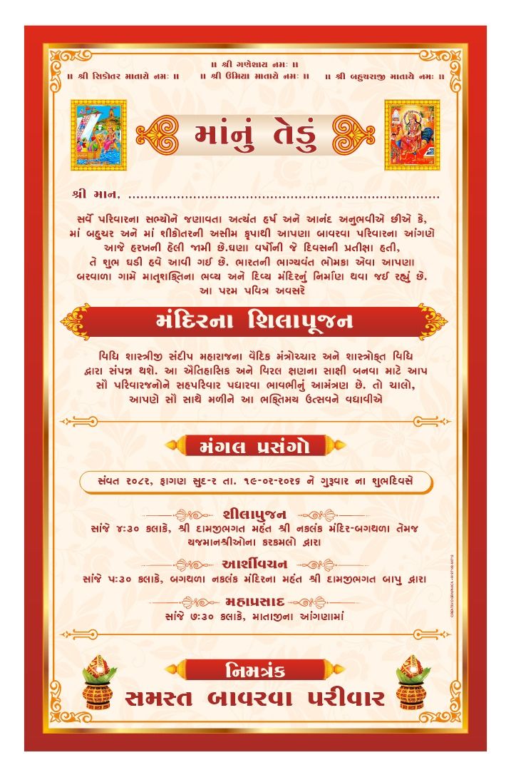 મોરબીના બરવાળા ગામે તારીખ ૧૯-૦૨-૨૦૨૬ ને ગુરુવારના રોજ બહુચર માં અને શિકોતર માતાજીના મંદિરના શિલાપુજન સાંજના ૪:૩૦ કલાકે શ્રી દામજીભગત મહંત શ્રી મંદિર બગથળાવાળા તથા યજમાનશ્રીઓ દ્વારા કરવામાં આવશે. તેમજ આ કાર્યક્રમમાં શ્રી દામજીભગત મહંત શ્રી દ્વારા આશિર્વચન આપવામાં આવશે અને સાંજના ૭:૩૦ કલાકે મહાપ્રસાદનુ પણ આયોજન કરવામાં આવ્યું છે જેથી આ કાર્યક્રમમાં પધારવા લોકોને બાવરવા પરિવાર દ્વારા આમંત્રણ પાઠવવામાં આવ્યું છે.