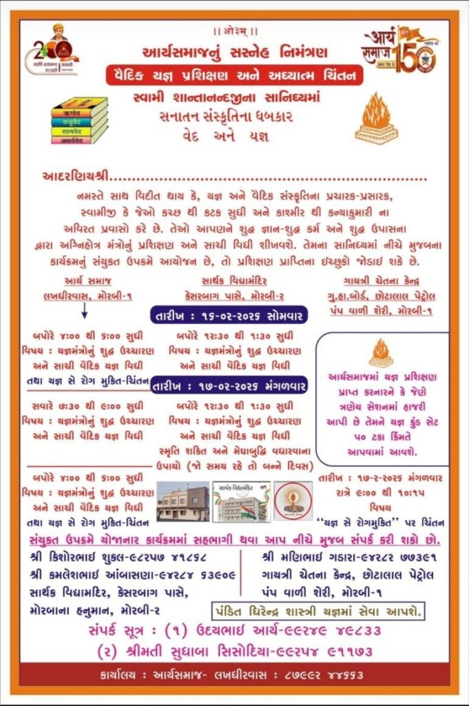 આ કાર્યક્રમ 16-02-2025 ને સોમવાર થી 17-02-2025 ને મંગળવાર દરમિયાન વિવિધ સમયગાળામાં આયોજિત કરવામાં આવ્યો છે. સવારે અને બપોરના સત્રોમાં યજ્ઞ પ્રશિક્ષણ આપવામાં આવશે, જ્યારે 17-02-2025 મંગળવારના રોજ રાત્રે 9 થી 10-15 સુધી “યજ્ઞ સે રોગ મુક્તિ” પર ચિંતન વિષય પર વિશેષ પ્રવચન યોજાશે. આર્યસમાજમાં યજ્ઞ પ્રશિક્ષણ પૂર્ણ કરનારને યજ્ઞ આયોજન માટે જરૂરી સામગ્રી પર 50 ટકા સુધીની છૂટ આપવામાં આવશે. વધુ માહિતી માટે ઉદયભાઈ આર્ય મો.નં. 9924949833 અથવા સુધાબા સિસોદીયા મો.નં. 9925491173 પર સંપર્ક કરવા જણાવાયું છે.