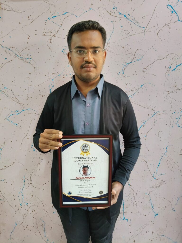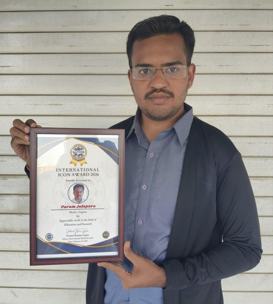 સામાન્ય રીતે ૧૮ વર્ષની ઉંમરે યુવાનો પોતાની કારકિર્દી પસંદ કરવામાં વ્યસ્ત હોય છે, ત્યારે મોરબીના યુવા લેખક અને સંશોધક પરમ જોલાપરાએ આધ્યાત્મિક સંશોધન ક્ષેત્રે આંતરરાષ્ટ્રીય સ્તરે ડંકો વગાડ્યો છે. ઉત્તર પ્રદેશ વર્લ્ડ રેકોર્ડ્સ (UPWR) દ્વારા આયોજિત ઓનલાઇન એવોર્ડ સમારોહમાં પરમ જોલાપરાને શિક્ષણ અને સંશોધન (Education & Research) ક્ષેત્રે તેમના અનન્ય પ્રદાન બદલ પ્રતિષ્ઠિત “International Icon Award 2026” એનાયત કરવામાં આવ્યો છે.