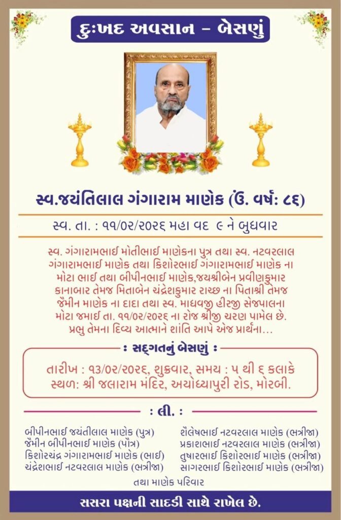 મોરબી : સ્વ.જયંતિલાલ ગંગારામ માણેક (ઉં.વ. ૮૬) તે સ્વ. ગંગારામભાઈ મોતીભાઈ માણેકના સુપુત્ર તથા સ્વ. નટવરલાલ ગંગારામભાઈ માણેક તથા કિશોરભાઈ ગંગારામભાઈ માણેકના મોટા ભાઈ તથા બીપીનભાઈ માણેક, જયશ્રીબેન પ્રવીણકુમાર કાનાબાર તેમજ મિતાબેન ચંદ્રેશકુમાર રાચ્છ ના પિતાશ્રી તેમજ જૈમીન માણેકના દાદા તથા સ્વ. માધવજી હીરજી સેજપાલના મોટા જમાઈ તા. ૧૧/૦૨/૨૦૨૬ ના રોજ શ્રીજી ચરણ પામેલ છે. સદ્ગતનું બેસણું તારીખ : ૧૩/૦૨/૨૦૨૬, શુક્રવાર, સમય : ૫ થી ૬ કલાકે, શ્રી જલારામ મંદિર, અયોધ્યાપુરી રોડ, મોરબી ખાતે રાખેલ છે. સસરા પક્ષની સાદડી સાથે રાખેલ છે
