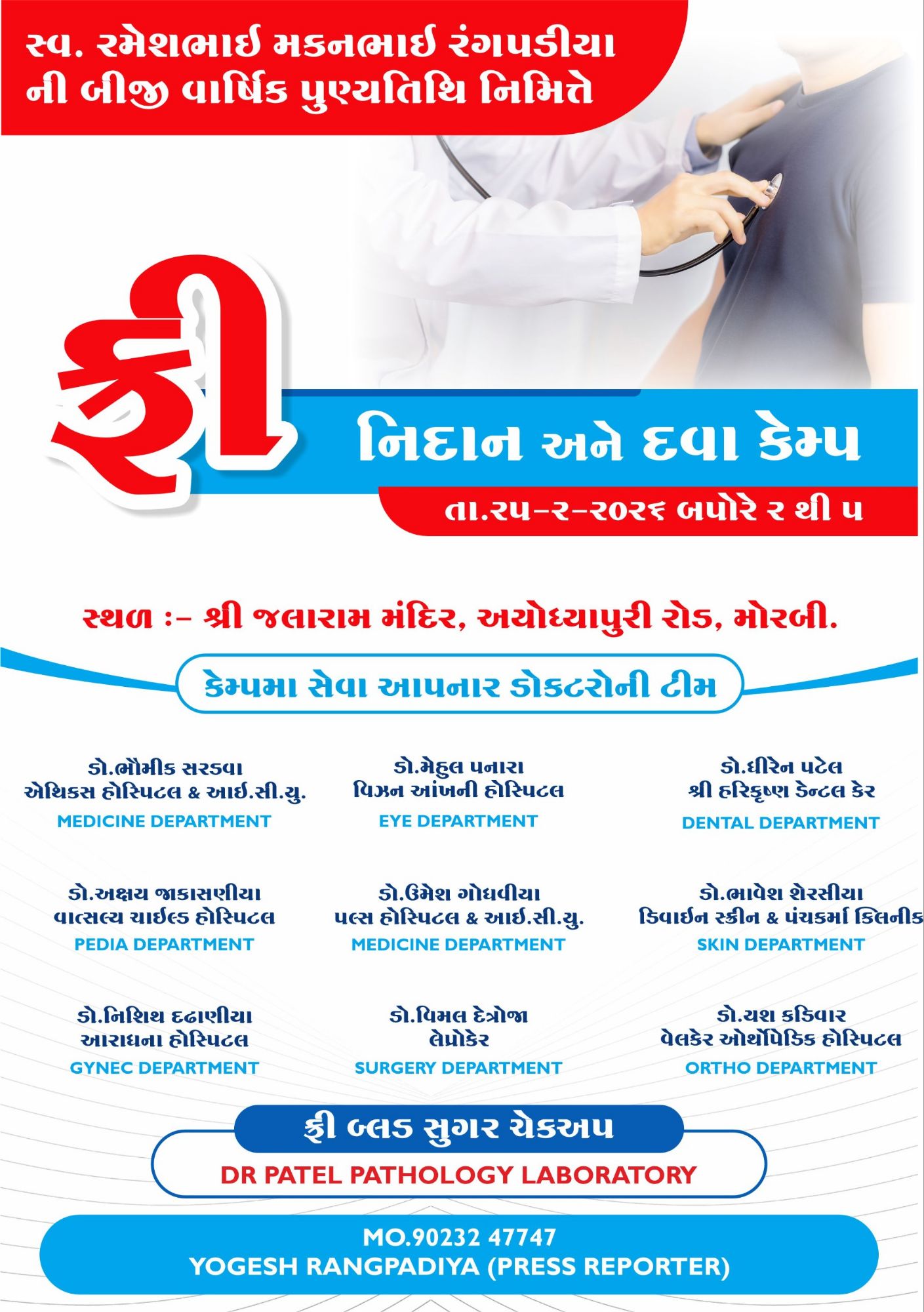 મોરબી: સ્વ.રમેશભાઈ મકનભાઈ રંગપડીયાની બીજી વાર્ષિક પુણ્યતિથિ નિમિત્તે તા.૨૫ ફેબ્રુઆરી ૨૦૨૬ના રોજ બપોરે ૨ થી ૫ દરમિયાન મોરબીના શ્રી જલારામ મંદિર અયોધ્યાપુરી રોડ ખાતે નિઃશુલ્ક નિદાન અને દવા કેમ્પનું આયોજન કરવામાં આવ્યું છે. વિવિધ વિભાગોના નિષ્ણાત ડોકટરો દ્વારા નિઃશુલ્ક તપાસ અને માર્ગદર્શન આપવામાં આવશે તેમજ ફ્રી બ્લડ સુગર ચેકઅપની સુવિધા ઉપલબ્ધ રહેશે.