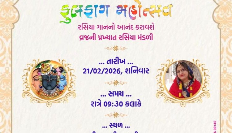 શ્રી મોરબી લોહાણા મહાજન દ્વારા ધાર્મિક અને સાંસ્કૃતિક પરંપરાને પ્રોત્સાહન આપવા હેતુસર ભવ્ય “હોળી કે રસિયા” કાર્યક્રમનું આયોજન કરવામાં આવ્યું છે. આ કાર્યક્રમ આવતી કાલે તા. 21/02/2026, શનિવારના રોજ રાત્રે 09:30 કલાકે યોજાશે.
