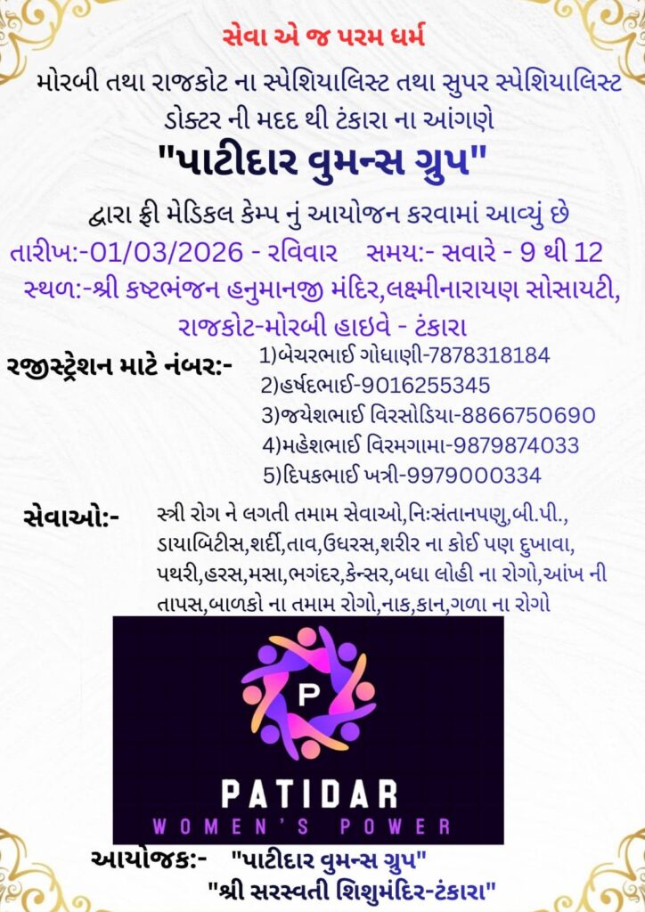પાટીદાર વુમન્સ પાવર ગ્રુપ દ્વારા અનેક સેવાકીય કાર્યો કરવામાં આવે છે જેમાં મેડિકલ કેમ્પ, કેન્સર સ્ક્રીનીંગ કેમ્પ, વૃધ્ધાશ્રમ – બાલાશ્રમ સહિતના સ્થળો પર કપડા, નાસ્તો વિતરણ સહિતની સેવા આપી રહ્યા છે ત્યારે આગામી તારીખ ૧ માર્ચ ના રોજ ટંકારાની લક્ષ્મીનારાયણ સોસાયટીમાં આવેલ શ્રી કષ્ટભંજન હનુમાનજી મંદિર ખાતે મેડિકલ કેમ્પનું આયોજન કરવામાં આવ્યું છે.તેમજ આ કેમ્પમાં આવનાર દર્દીઓને દવા નિઃશુલ્ક આપવામાં આવશે જે દવાનો તમામ ખર્ચ વર્ષાબેન ભીમાણી ઉઠાવશે તો આ કેમ્પમાં હેલ્થકેર લેબોરેટરી ના રાહુલ શિયાલ દ્વારા હિમોગ્લોબિન, બ્લડ ગ્રુપ અને સુગર ના રિપોર્ટ નિશુલ્ક કરી આપવા આવશે.