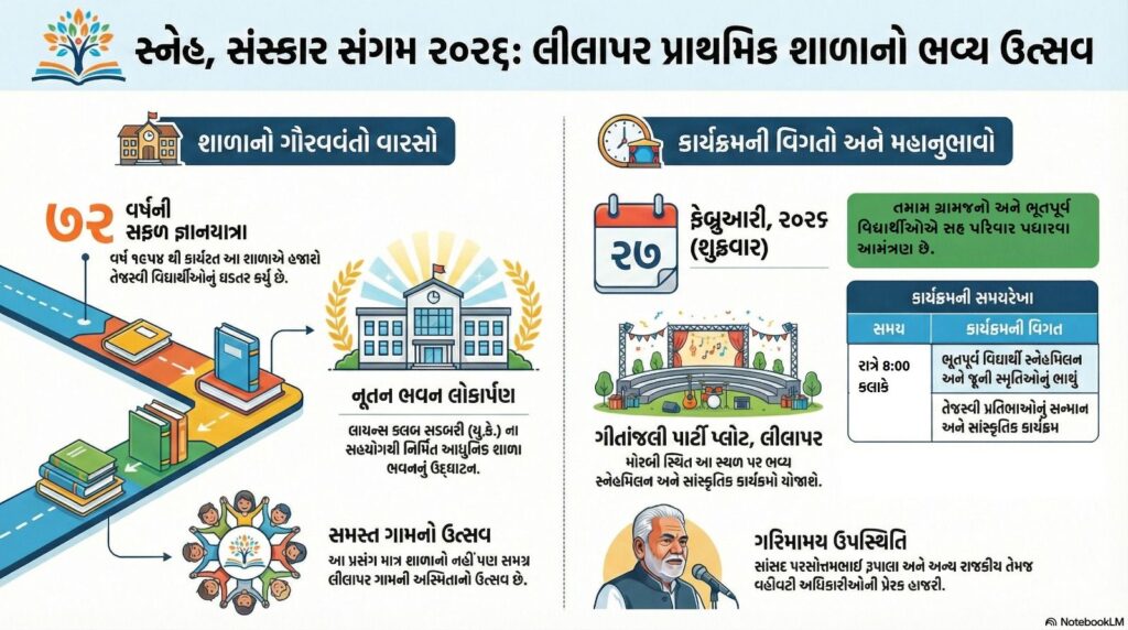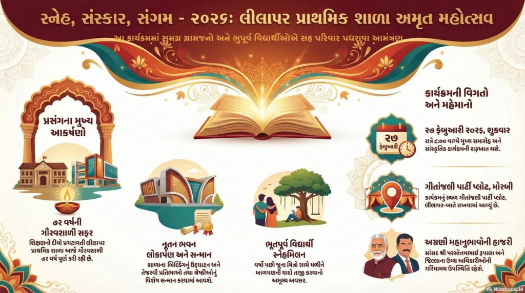 મોરબી : મોરબીના લીલાપર ગામે આવેલી લીલાપર પ્રાથમિક શાળા ૭૨ વર્ષ પૂર્ણ કરી રહી છે. આ શાળાની સ્થાપના ૨૭ ફેબ્રુઆરી ૧૯૫૪ના રોજ થઈ હતી. આ ગૌરવશાળી અવસરની ઉજવણીના ભાગરૂપે આગામી તારીખ ૨૭/૦૨/૨૦૨૬ ને શુક્રવારના રોજ રાત્રે ૮:૦૦ કલાકે એક ભવ્ય કાર્યક્રમનું આયોજન કરવામાં આવ્યું છે.