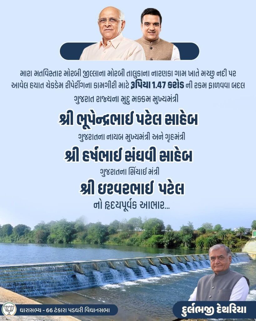મોરબી : ટંકારા પડધરી વિસ્તારના લોકલાડીલા ધારાસભ્ય દુલર્ભજીભાઈ દેથરીયા લોકોના પ્રાણ પ્રશ્નો ઉકેલવા સતત પ્રયત્નશીલ હોય તેમના આ પ્રયાસો ફળીભૂત થતા ગુજરાત સરકાર દ્વારા મોરબીના નારણકા ગામે મચ્છુ નદી પર બંધાયેલા ચેકડેમના રીપેરીંગ માટે રૂ.1.47 કરોડ મંજૂર કરવામાં આવ્યા છે. આ તકે તેઓએ ગૌરવની લાગણી વ્યક્ત કરી હતી કે, મારા મતવિસ્તાર મોરબી જીલ્લાના મોરબી તાલુકાના નારણકા ગામ ખાતે મચ્છુ નદી પર આવેલ હયાત ચેકડેમ રીપેરીંગના કામગીરી માટે રૂપિયા 1.47 કરોડની રકમ ફાળવવા બદલ ગુજરાત રાજ્યના મુદુ મક્કમ મુખ્યમંત્રી શ્રી ભૂપેન્દ્રભાઈ પટેલ સાહેબ ગુજરાતના નાયબ મુખ્યમંત્રી અને ગૃહમંત્રી શ્રી હર્ષભાઈ સંઘવી સાહેબ ગુજરાતના સિંચાઈ મંત્રી શ્રી ઈશ્વરભાઈ પટેલનો હૃદયપૂર્વક આભાર માનું છું.