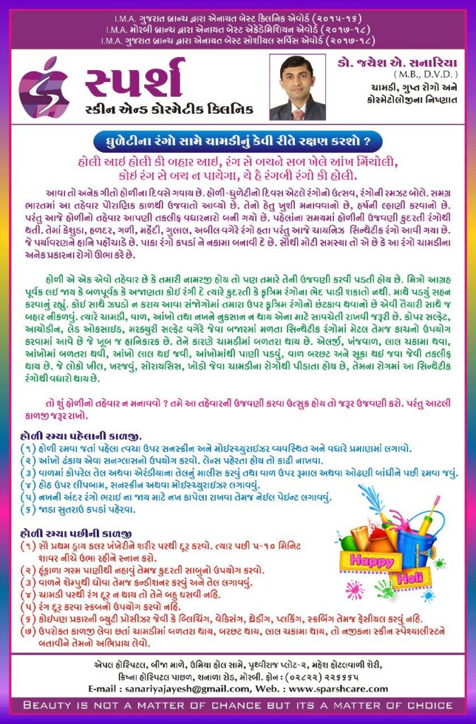 મોરબી: હોળી અને ધુળેટી એટલે રંગોનો ઉત્સવ. જોકે, આજના સમયમાં કુદરતી રંગોનું સ્થાન કેમિકલયુક્ત સિન્થેટીક રંગોએ લઈ લીધું છે. આ રંગો ચામડી, વાળ અને આંખો માટે અત્યંત નુકસાનકારક સાબિત થઈ શકે છે. ત્યારે આ હાનિકારક રંગોથી બચવા અને તહેવારની સુરક્ષિત ઉજવણી કરવા માટે મોરબીના શનાળા રોડ પર આવેલ ‘સ્પર્શ સ્કીન એન્ડ કોસ્મેટીક ક્લિનિક’ના નિષ્ણાત ડો. જયેશ એ. સનારિયા (M.B., D.V.D.) દ્વારા ત્વચા અને વાળની જાળવણી માટે કેટલીક મહત્વપૂર્ણ સાવચેતીઓ અને ટિપ્સ આપવામાં આવી છે.