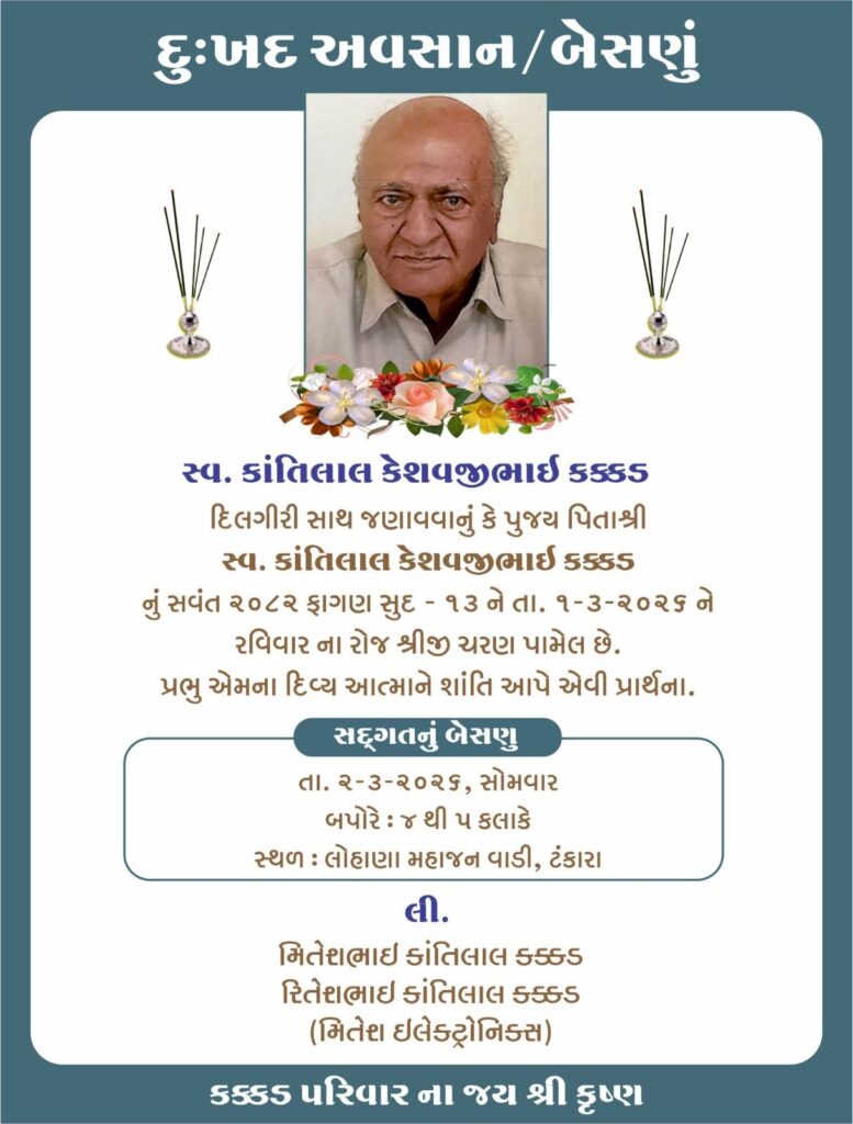 ટંકારા: નેસડા સુરજી નિવાસી કાંતિલાલ કેશવજીભાઈ કક્કડ (ટંકારા લોહાણા મહાજન પ્રમુખ) (ઉ.વ.80) તે મિતેશભાઈ (મિતેશ ઇલેક્ટ્રોનિક્સ વાળા) અને રિતેશભાઈના પિતાનું તારીખ 1-3-2026 ને રવિવારના રોજ અવસાન થયું છે. સદગતનું બેસણું તારીખ 2-3-2026 ને સોમવારના રોજ સાંજે 4 થી 6 કલાકે લોહાણા મહાજન વાડી, દેરીનાકા મેઈન રોડ, ટંકારા ખાતે રાખવામાં આવ્યું છે.