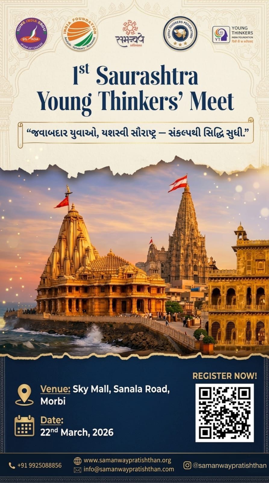 મોરબી: આજના સમયમાં દેશ અને સમાજના નવનિર્માણ માટે યુવા શક્તિની ભૂમિકા સૌથી મહત્વની છે. યુવાનો પાસે શક્તિ, ક્ષમતા અને સંભાવનાઓનો અખૂટ ભંડાર છે, પરંતુ તેને સાચી દિશા અને યોગ્ય પ્લેટફોર્મ મળવું જરૂરી છે. યુવાનોની આ શક્તિ અને ક્ષમતાને સાચા અર્થમાં કેળવવા, તેમને એક સક્ષમ વિચારમંચ પૂરું પાડવા અને સાચી દિશા આપવાના ઉદ્દેશ્ય સાથે મોરબીમાં એક ભવ્ય વૈચારિક ક્રાંતિનું આયોજન કરવામાં આવ્યું છે. જેમાં યંગ ઇન્ડિયા ગ્રુપ અને સમન્વય પ્રતિષ્ઠાનના સંયુક્ત ઉપક્રમે આગામી 22 માર્ચ 2026ના રોજ શનાળા રોડ પર આવેલા સ્કાય મોલ ખાતે ‘1st સૌરાષ્ટ્ર યંગ થિન્કર્સ મીટ’નું ભવ્ય આયોજન કરવામાં આવ્યું છે.