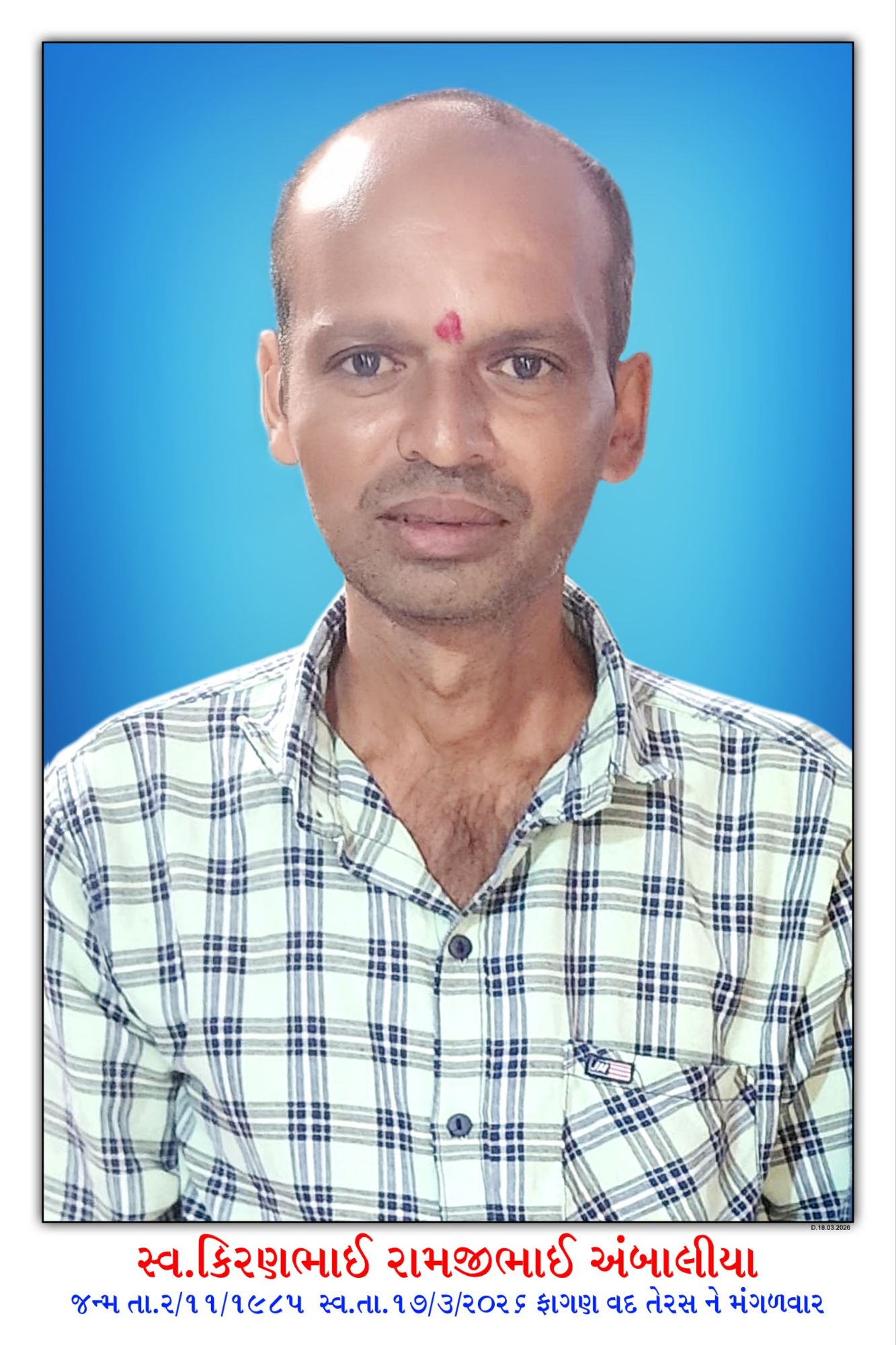 મોરબી : મોરબી નિવાસી કિરણભાઈ રામજીભાઈ અંબાલીયા તે સ્વ. રામજીભાઈ કરશનભાઈ અંબાલીયા અને કાન્તાબેન રામજીભાઈ અંબાલીયાના પુત્ર, સરોજબેન વસંતભાઈ પરમાર, રાજેશ રામજીભાઈ અંબાલીયા (પત્રકાર), પ્રદીપ રામજીભાઈ અંબાલીયાના ભાઈ, દર્શનાબેન અને રેખાબેનના દિયર,વસંતકુમાર જે. પરમારના સાળાનુંતારીખ 17-03-2026 ને મંગળવારના રોજ અવસાન થયું છે. સદગતનું બેસણું તારીખ 19-03-2026 ને ગુરુવારના રોજ સવારના 10 થી 12 વાગ્યે તેમના નિવાસ સ્થાન 13, મારુતિ પ્લોટ, સો-ઓરડી, પરમાર પાન વાળી શેરી, મોરબી-2 ખાતે રાખવામાં આવ્યું છે.