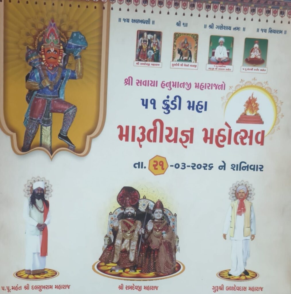 હળવદ: શક્તિનગર નકલંક ગુરુધામ ખાતે શ્રી સવાયા હનુમાનજી મહારાજની પવિત્ર છત્રછાયામાં ચૈત્ર સુદ ત્રીજ ૨૧ માર્ચ ૨૦૨૬, શનિવારના રોજ 51 કુંડી મહા મારુતિ યજ્ઞ મહોત્સવનું ભવ્ય આયોજન કરવામાં આવ્યું છે.