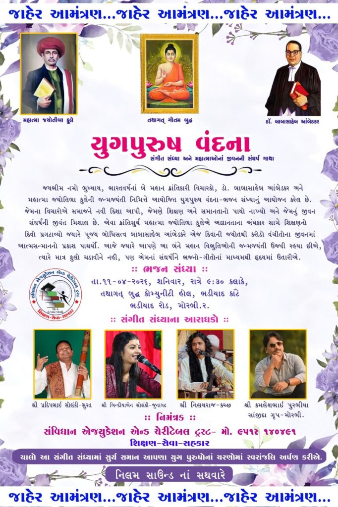 ભારત વર્ષના બે મહાન સમાજ સુધારકો અને યુગપુરૂષો એવા ડો. બાબા સાહેબ આંબેડકરજી અને મહાત્મા જ્યોતિબા ફુલેજીની જન્મજયંતિ નિમિત્તે સંવિધાન ચેરિટેબલ એન્ડ એજયુકેશન ટ્રસ્ટ- મોરબી દ્વારા “યુગપુરૂષ વંદના” સંગીત સંધ્યા તેમજ મહાપુરૂષો ની જીવન સંઘર્ષ ગાથા નું આયોજન કરવા માં આવેલ છે