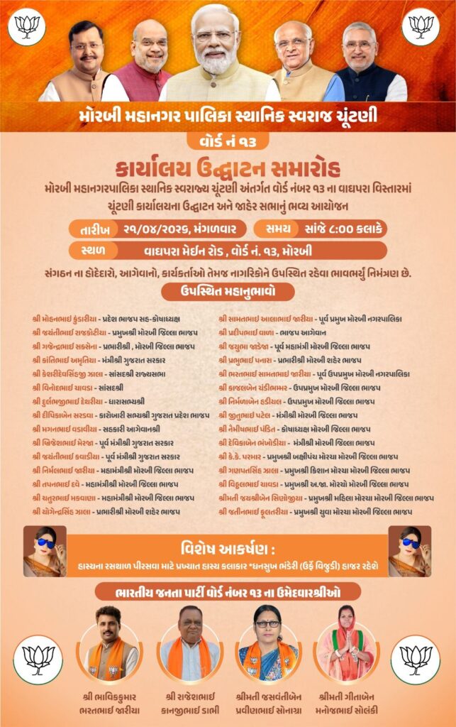 મોરબી મહાનગરપાલિકાની સ્થાનિક સ્વરાજ્યની ચૂંટણીને લઈને રાજકીય માહોલ ગરમાયો છે. આગામી 26/04/2026 ના રોજ મતદાન થવા જઈ રહ્યું છે ત્યારે વિવિધ પાર્ટીઓ દ્વારા પ્રચારનો ધમધમાટ શરૂ કરી દેવામાં આવ્યો છે. આ અંતર્ગત ભારતીય જનતા પાર્ટી દ્વારા મોરબીના વોર્ડ નંબર 13 ના વાઘપરા વિસ્તારમાં ચૂંટણી કાર્યાલયના ઉદ્ઘાટન અને જાહેર સભાનું ભવ્ય આયોજન કરવામાં આવ્યું છે. આ ભવ્ય ઉદ્ઘાટન સમારોહ આજે તારીખ 21/04/2026, મંગળવારના રોજ સાંજે 8:00 કલાકે વાઘપરા મેઈન રોડ, વોર્ડ નં. 13, મોરબી ખાતે યોજાશે.