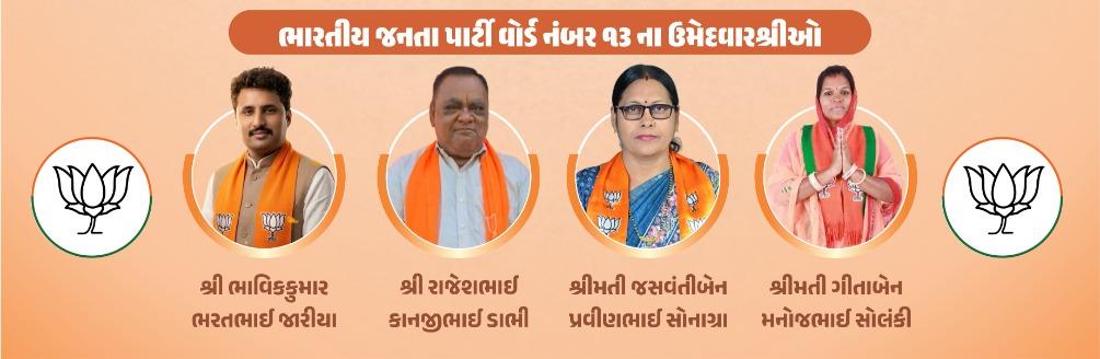 આ ચૂંટણીમાં વોર્ડ નંબર 13 માંથી ભાજપના ઉમેદવારો તરીકે ભાવિકકુમાર ભરતભાઈ જારીયા, રાજેશભાઈ કાનજીભાઈ ડાભી, જસવંતીબેન પ્રવીણભાઈ સોનાગ્રા અને ગીતાબેન મનોજભાઈ સોલંકી મેદાનમાં છે. આ કાર્યક્રમમાં વિશેષ આકર્ષણ તરીકે પ્રખ્યાત હાસ્ય કલાકાર ધનસુખ ભંડેરી (ઉર્ફે વિજુડી) અને રાજેન્દ્ર પંચાલ ઉપસ્થિત રહેશે. તેઓ પોતાની આગવી શૈલીમાં લોકોને હાસ્યરસ પીરસશે અને ભારતીય જનતા પાર્ટીના ઉમેદવારોને જંગી બહુમતીથી જીતાડવા માટે મતદારોને અપીલ કરશે.